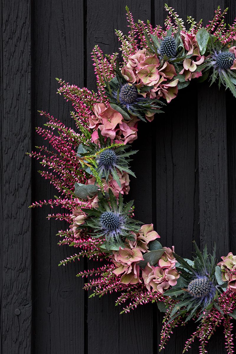 Här har vi skapat en höstkrans med rosa hortensia, ljung, tistel och eukalyptus. Den är även superfin som torkad. Hållbart och snyggt!