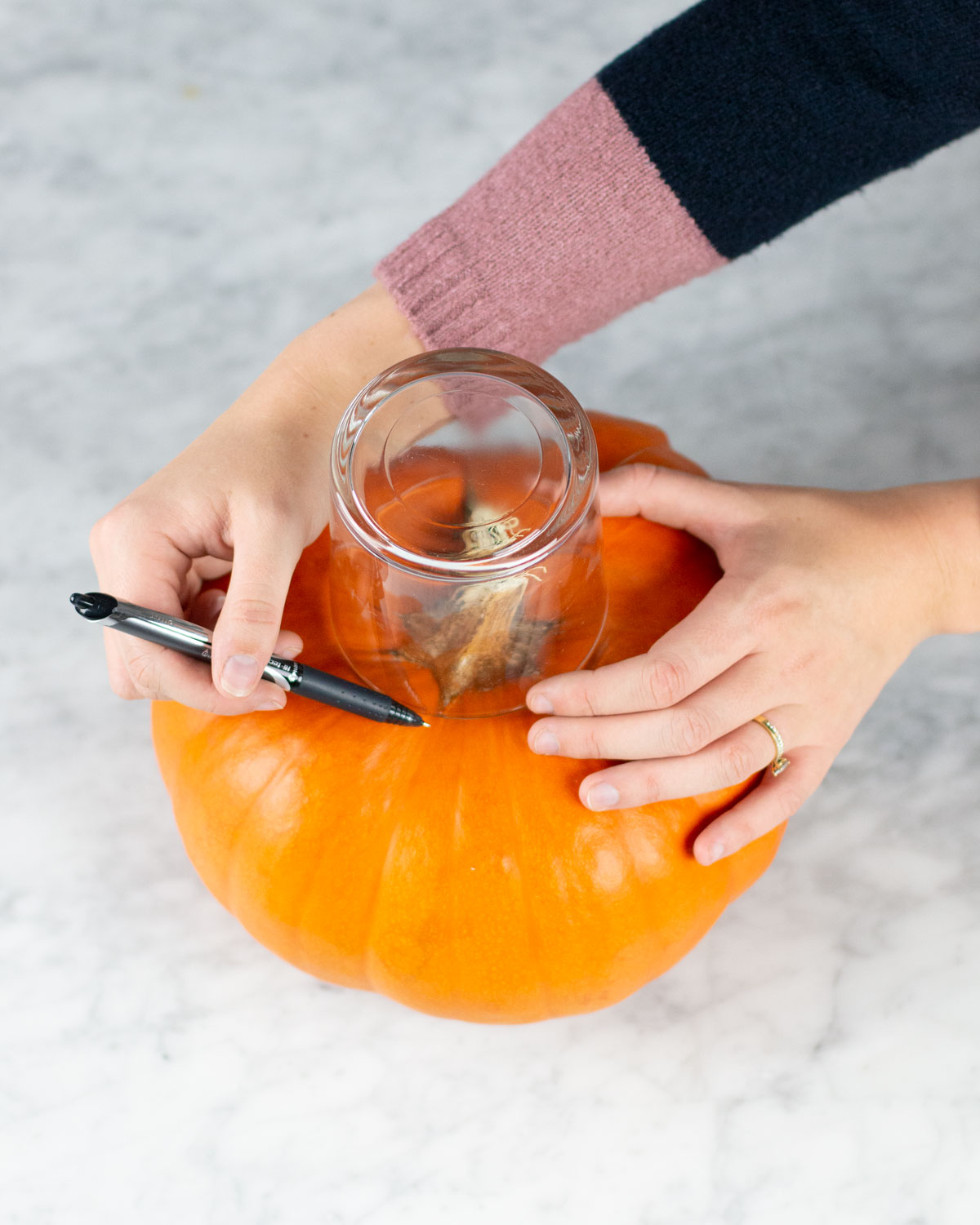 1. Placera glasvasen upp och ner i mitten av pumpan. Markera med en penna runt vasen för att mäta ut hur stort hål du behöver göra.