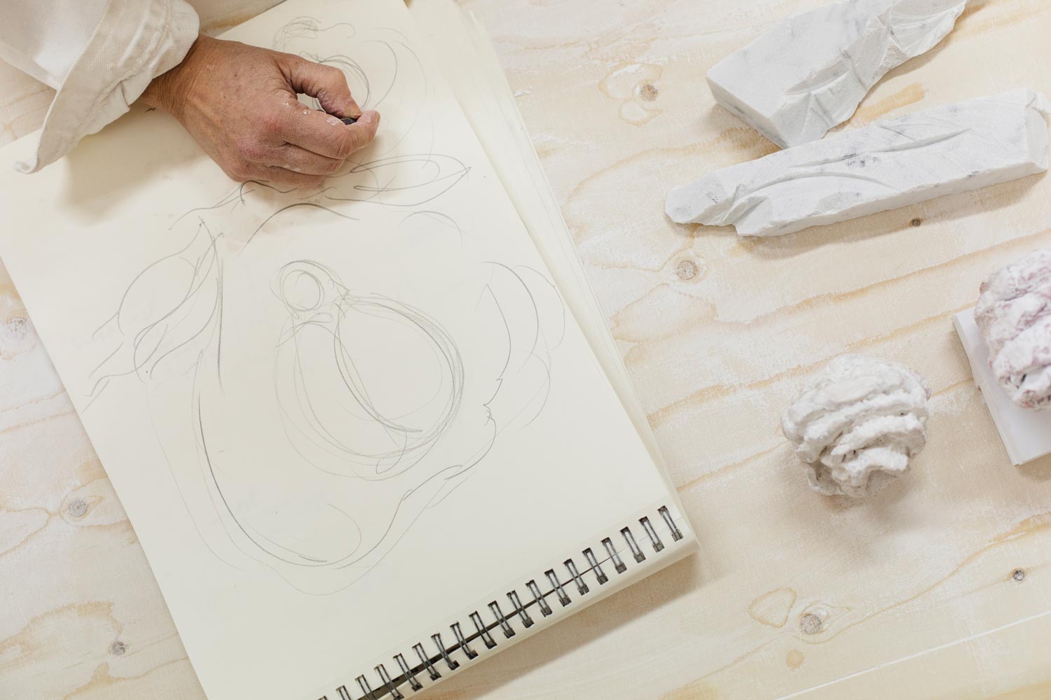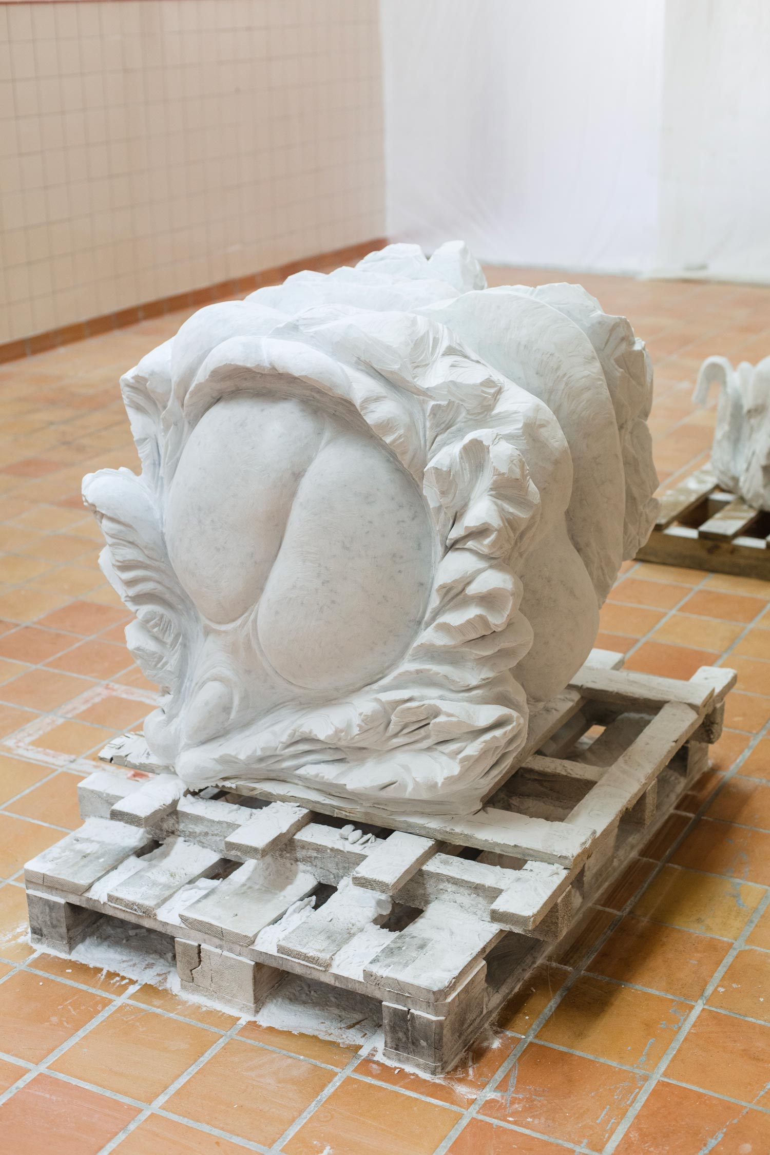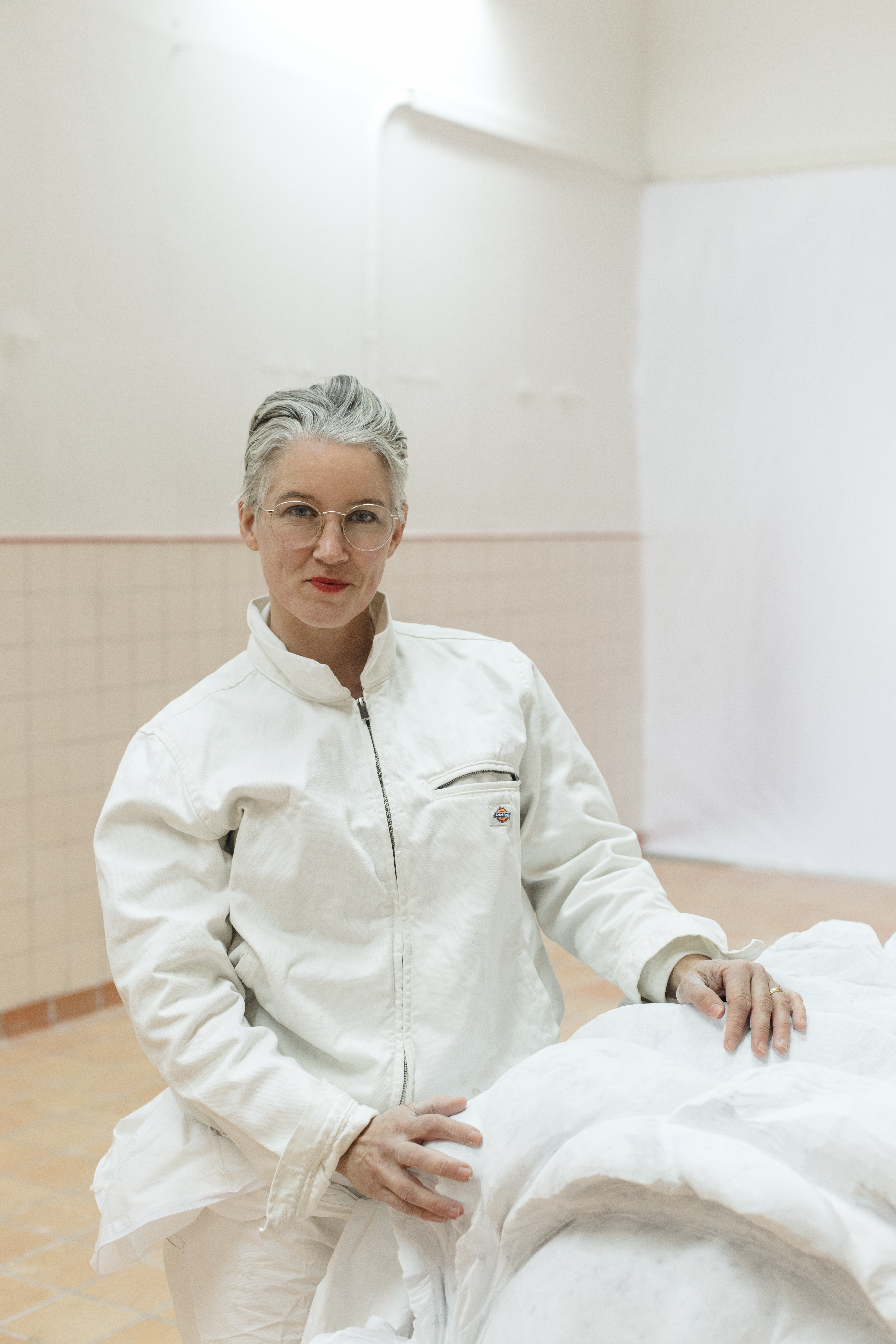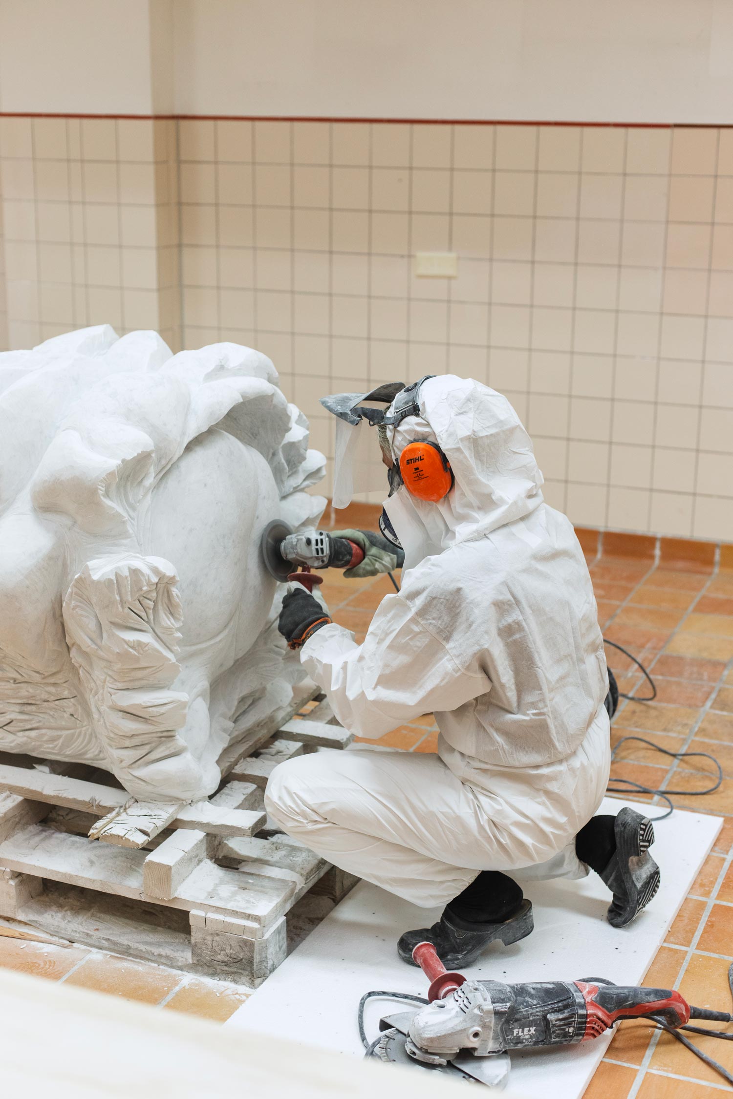 Hon har vita skyddskläder och under städningen bar hon även visir och gasmask, precis som när hon skulpterar. Stendammet bolmar i luften vid minsta rörelse.