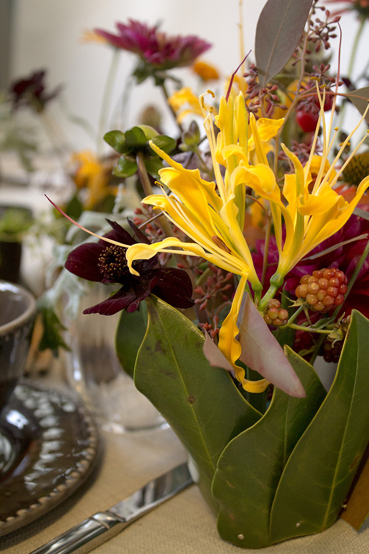 En oblekt linneduk är en fin grund för dukningen, som har ett naturligt tema. Det som kanske inte passar in kan alltid kamoufleras – här har till exempel några magnoliablad nålats ihop som ett foder runt en vas.