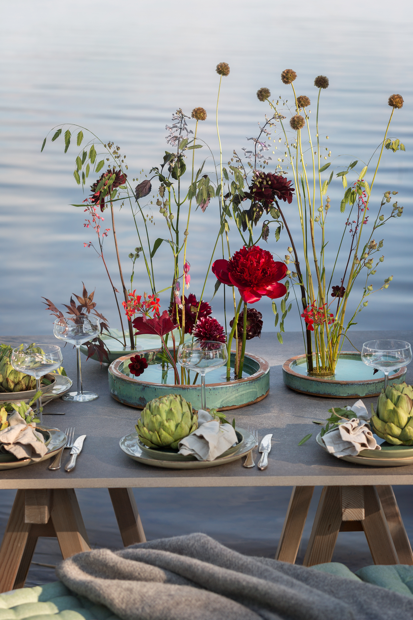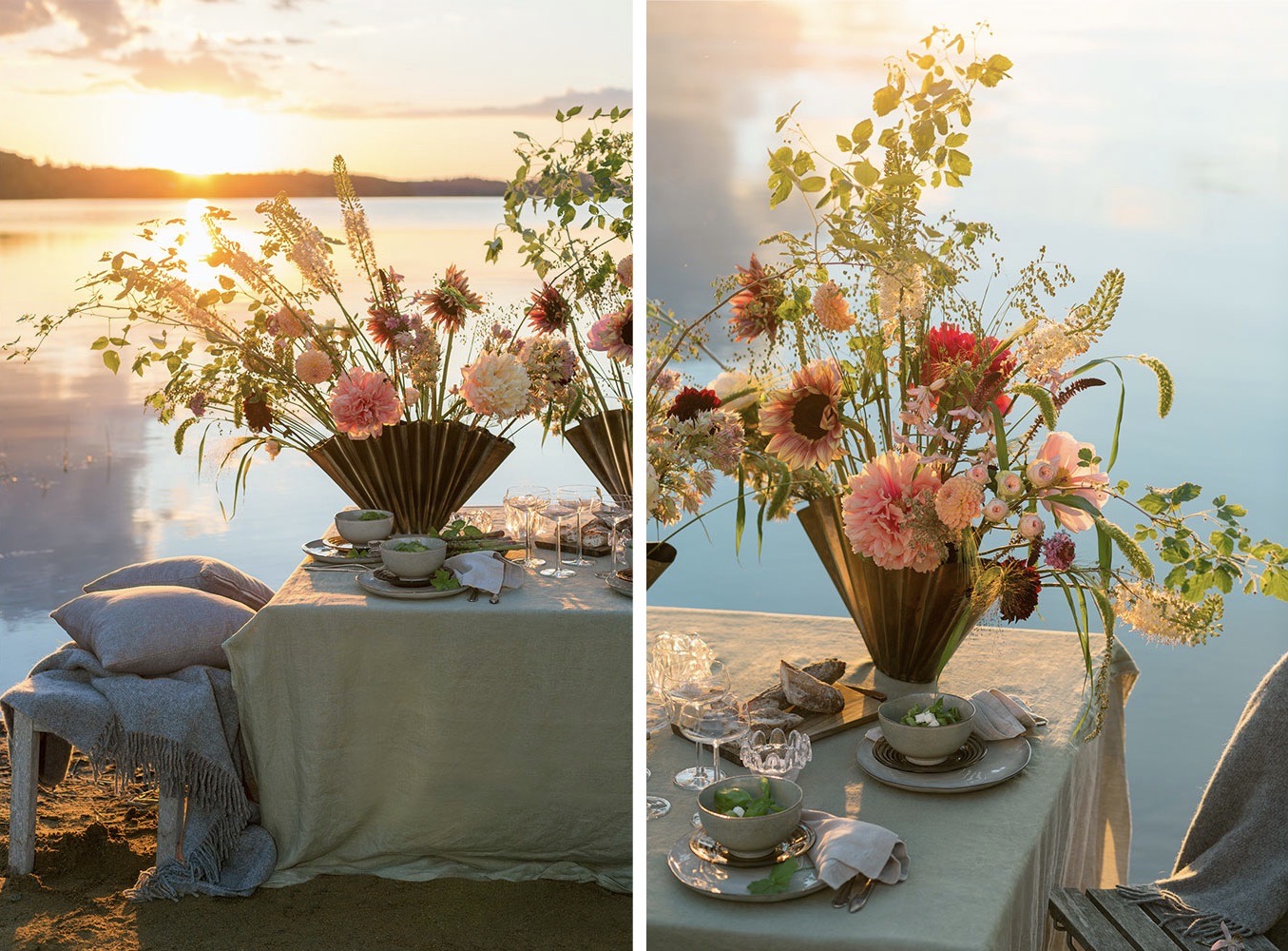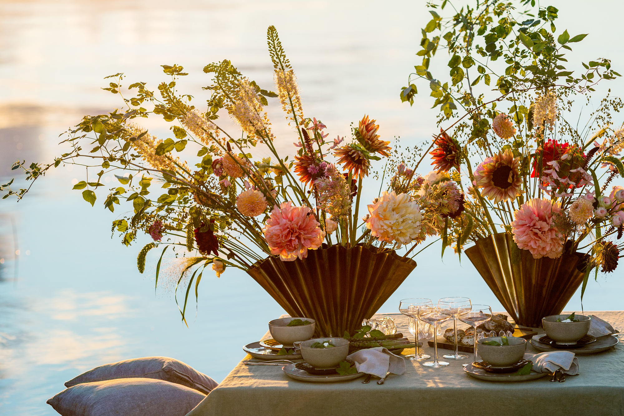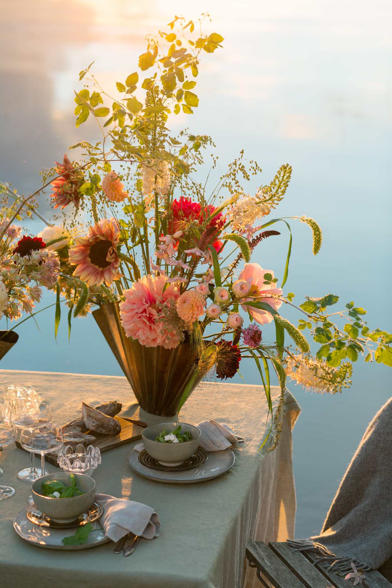 Blommor i dukningen: Hallonkvistar, stäpplilja, solrosor, pioner, dahlia, liten protea, scabiosa, blomstermorot, kvistros, olika gräs