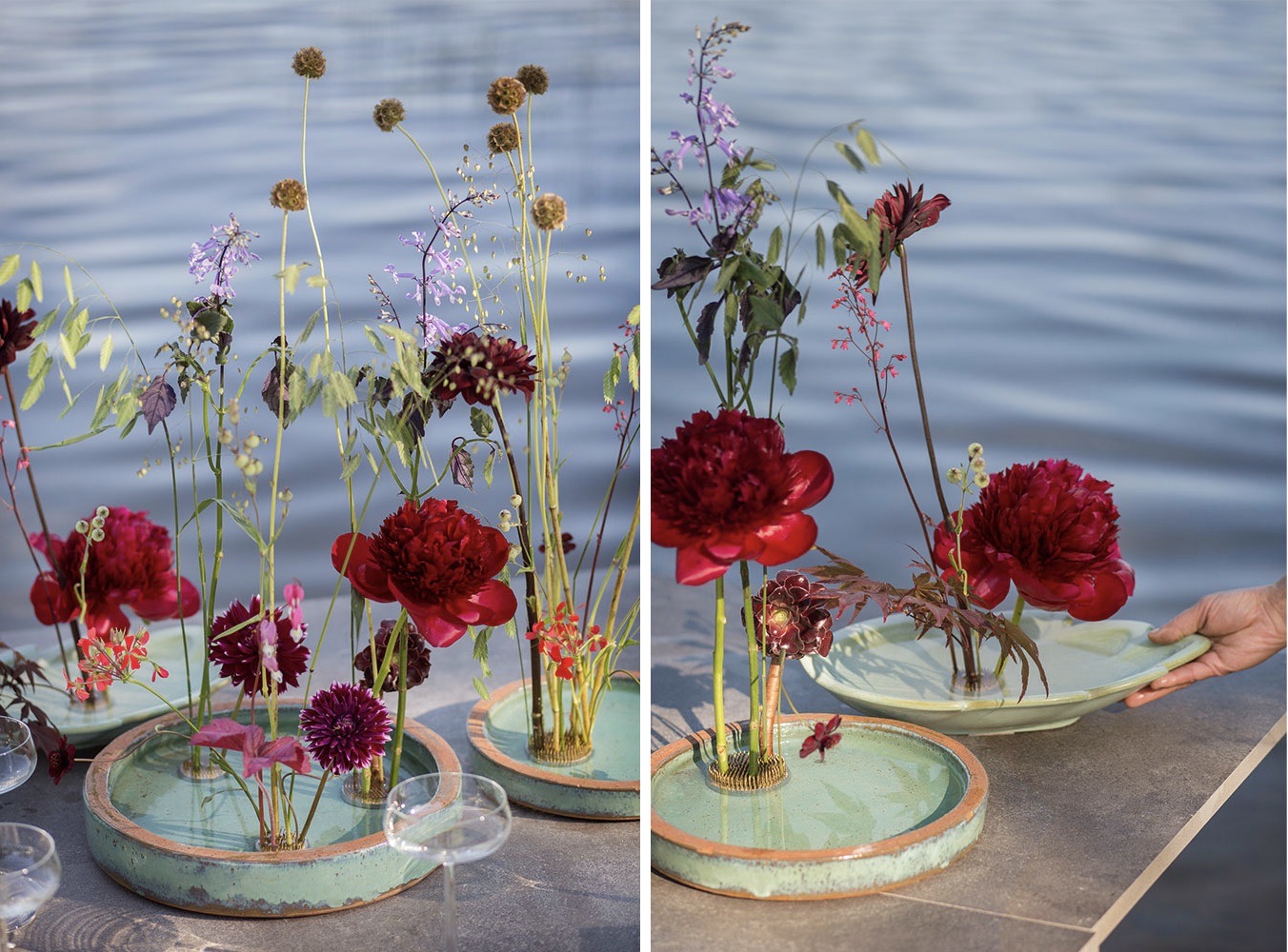 Det här är en tacksam dukning som inte kräver så mycket blommor. Här arbetar du med vackra fat i olika storlekar och färger som går ton i ton. Med hjälp av fakirer i olika storlekar som är placerade i faten, dekorerar du med ett fåtal blommor. Om man använder sig av blommor med lite olika karaktär, storlek och höjd får man en stilren och elegant känsla. Vattenspegeln i faten skapar en stämningsfull effekt i dukningen.