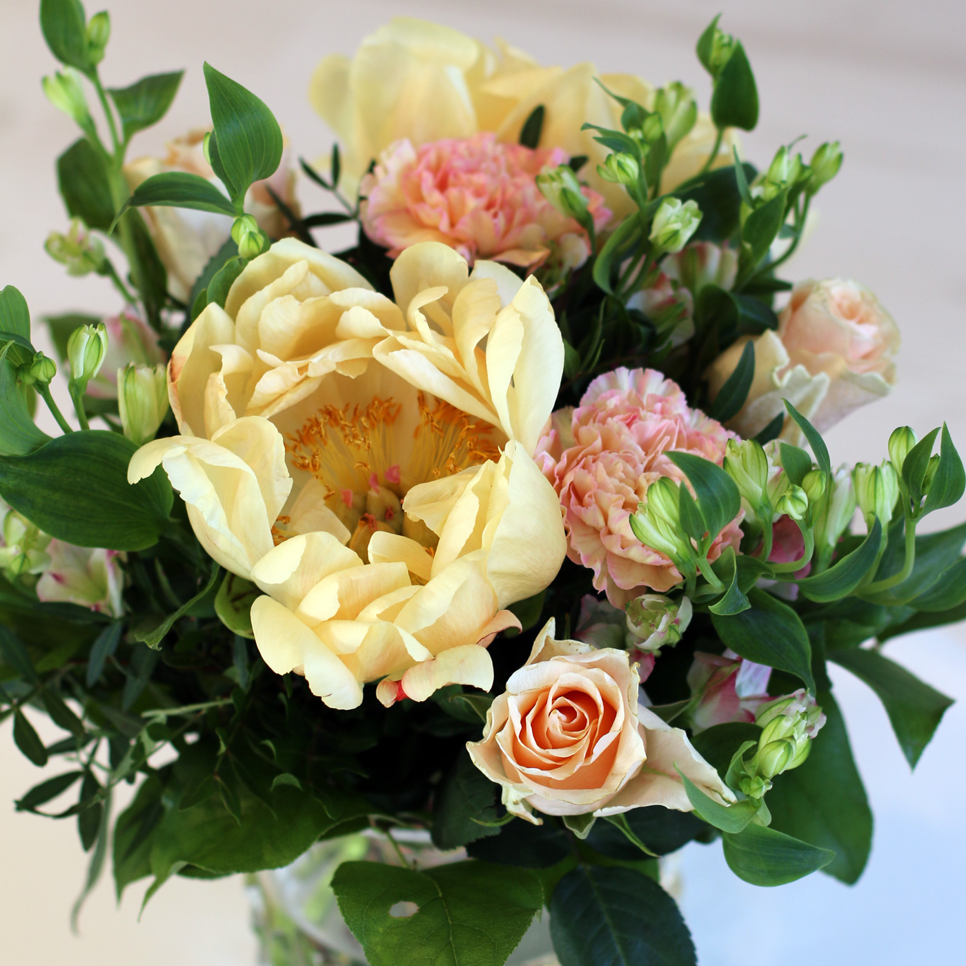 När du ska stoppa pionerna i vatten är det viktigt att du ger dem nya snittytor, även om floristen har gjort det innan. Använd en vass kniv och gör ett diagonalt snitt. Då kan pionerna ta upp vattnet och blomma ut.
